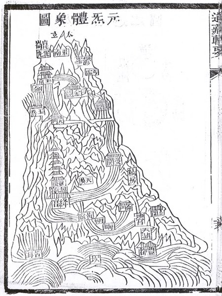 Nicht in der äußeren Welt ist diese Gebirgslandschaft zu finden; vielmehr handelt es sich um eine Karte des „inneren Landes”, nämlich des Körpers, durch den die Qi-Energie fließt wie Ströme und Bäche, während Paläste, Hallen und Tore seine Organe markieren und seine Spitze der mythische Weltberg Kunlun. Daozang-jiyao [„Die wichtigsten Schriften des taoistischen Kanons“]