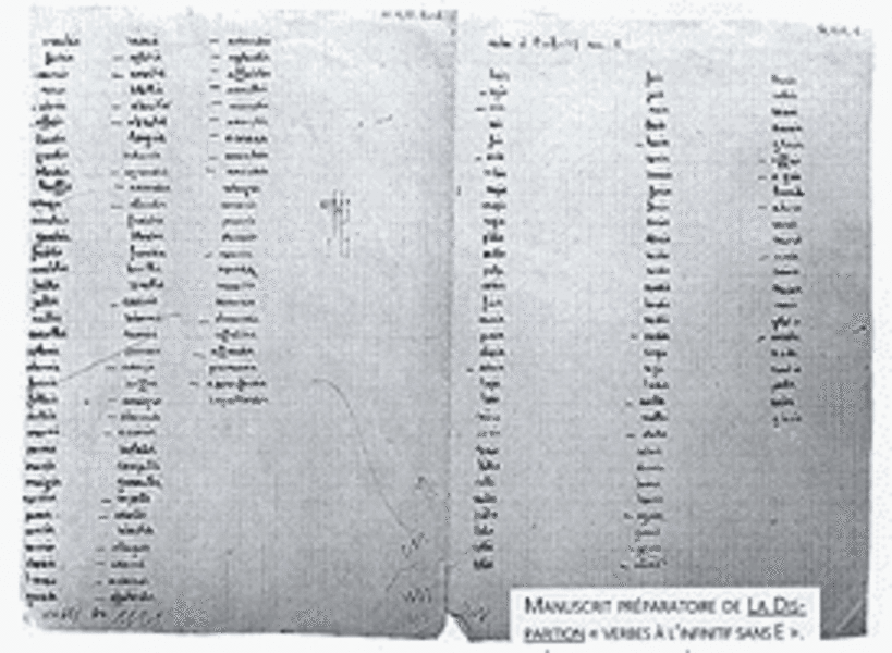 In Georges Perecs „lipogrammatischem“ Buch des Verschwindens (La disparition, 1969) wird die Romanmaschine durch eine genial einfache Initialschaltung angeworfen: den Ausschluß aller Wörter, die den Buchstaben „e“ enthalten – extensive Vokabellisten aus der Vorbereitungsphase zeugen von der Suche nach nicht-inkriminiertem Sprachmaterial.