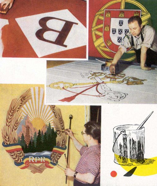 Ob Ährenkranz, ob Petrischlüssel: die geübte Hand der Bonner Fahnenmaler verlieh sowohl den Insignien des Papstes als auch denen des sozialistischen Auslands künstlerische Perfektion. Hoeft, Erwin: Fahnen wehen in aller Welt