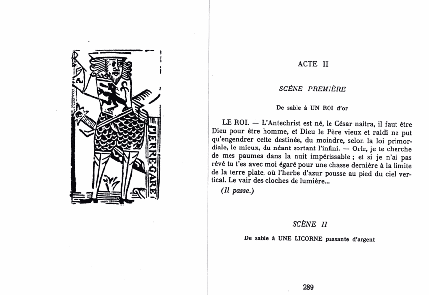 „De sable à une licorne passante d’argent“ („in Schwarz ein schreitendes silbernes Einhorn“): Wenn heraldische Figuren zu handelndem Dramenpersonal werden, können wir uns nur im „acte héraldique“ aus Alfred Jarrys apokalyptischem Schauspiel César-Antechrist (1895) befinden.