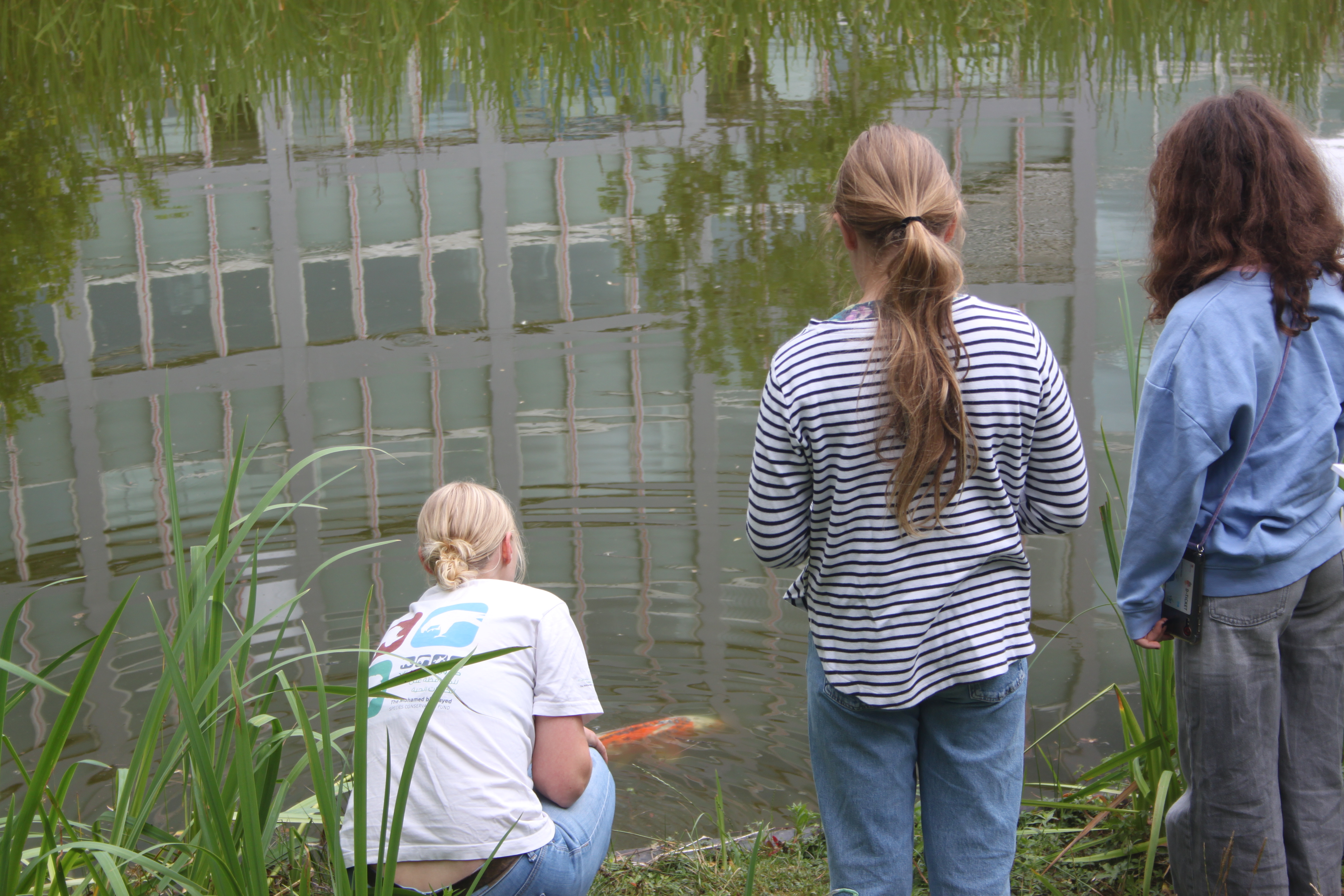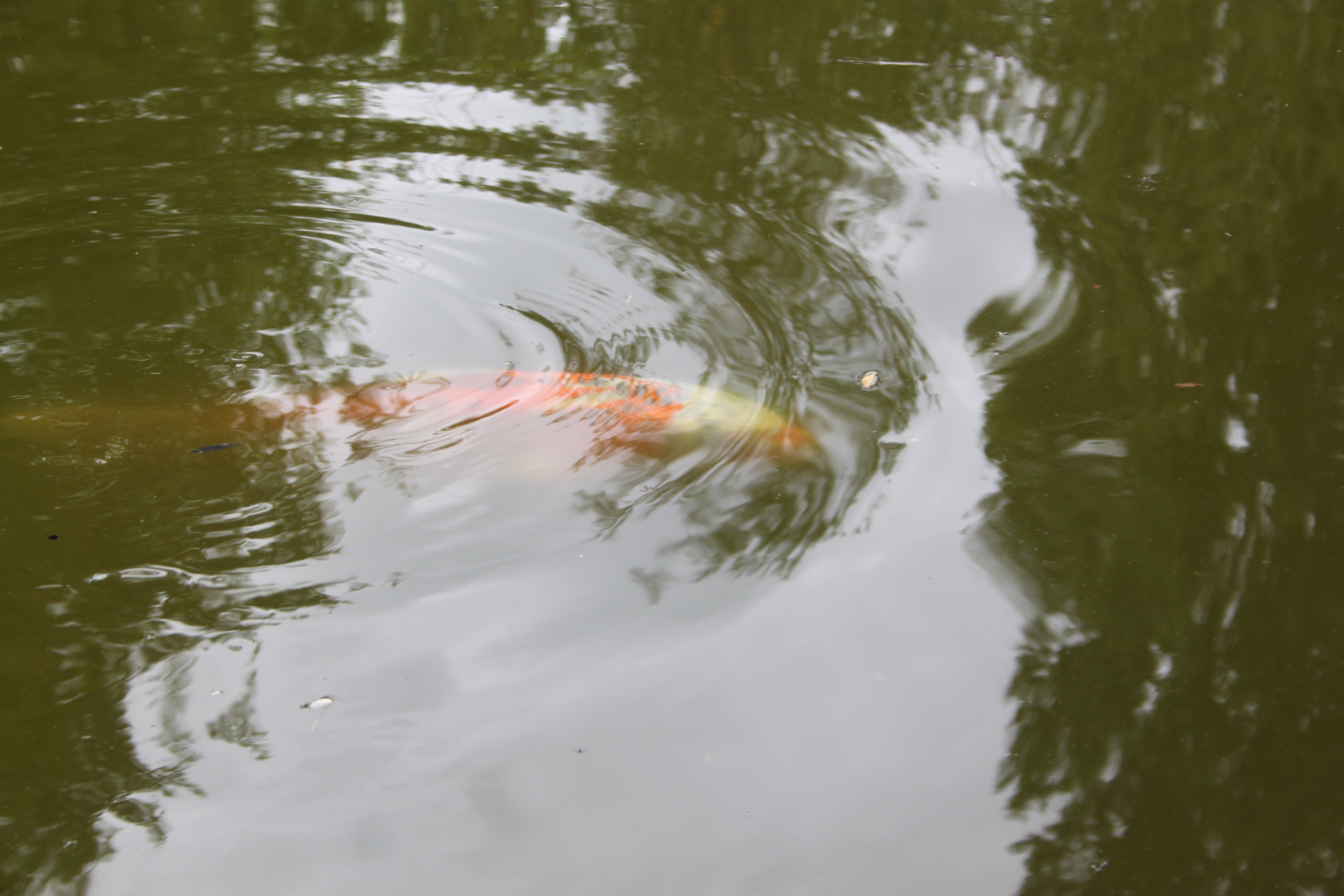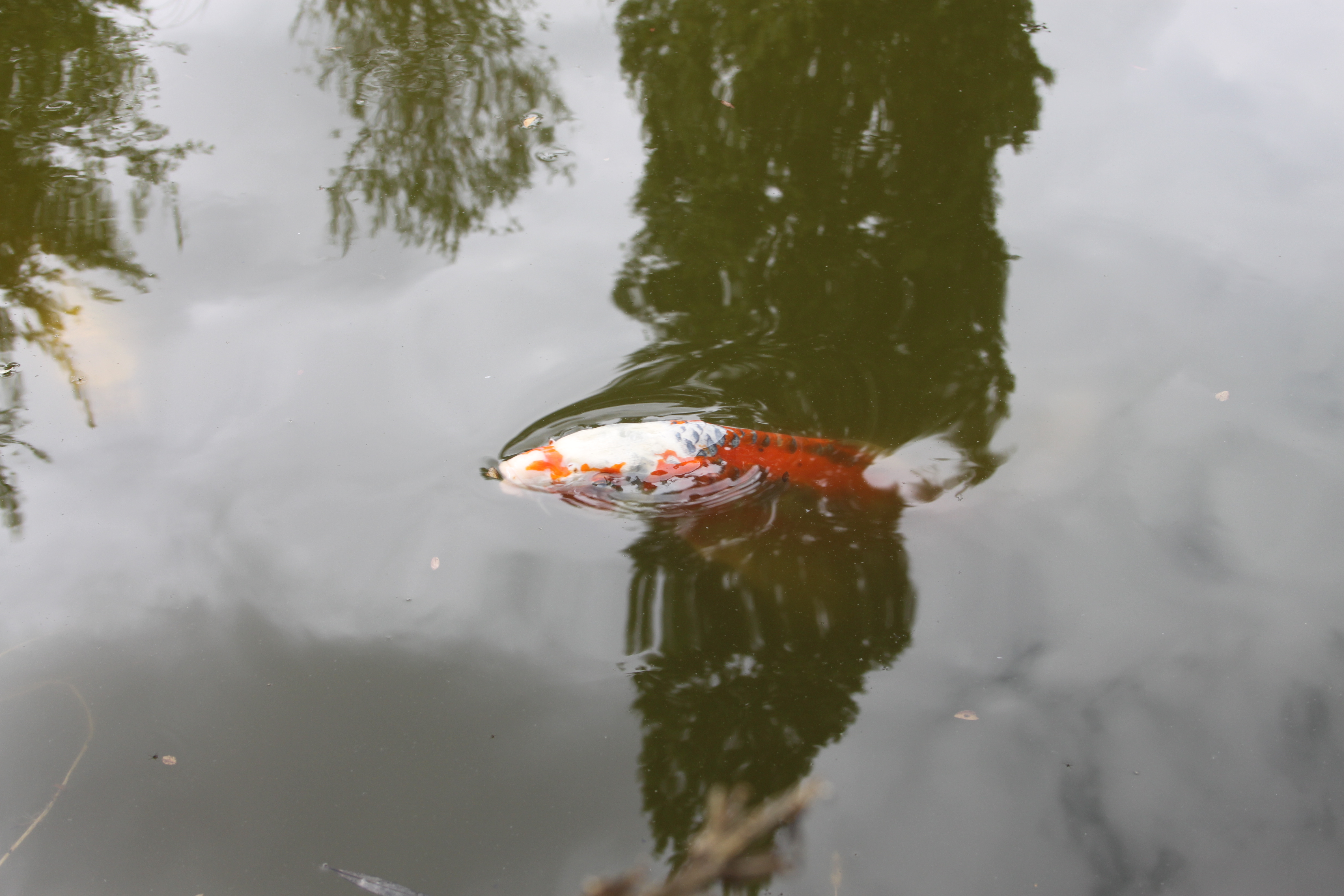 Koi-Karpfen sind sehr zutraulich. Sie werden bis zu 226 Jahre alt. Diese Fischart hat meistens die Farben Orange, Schwarz und Weiß. Auch wenn die Veranstaltung so hieß, können wir natürlich nicht mit den Koi-Karpfen reden.