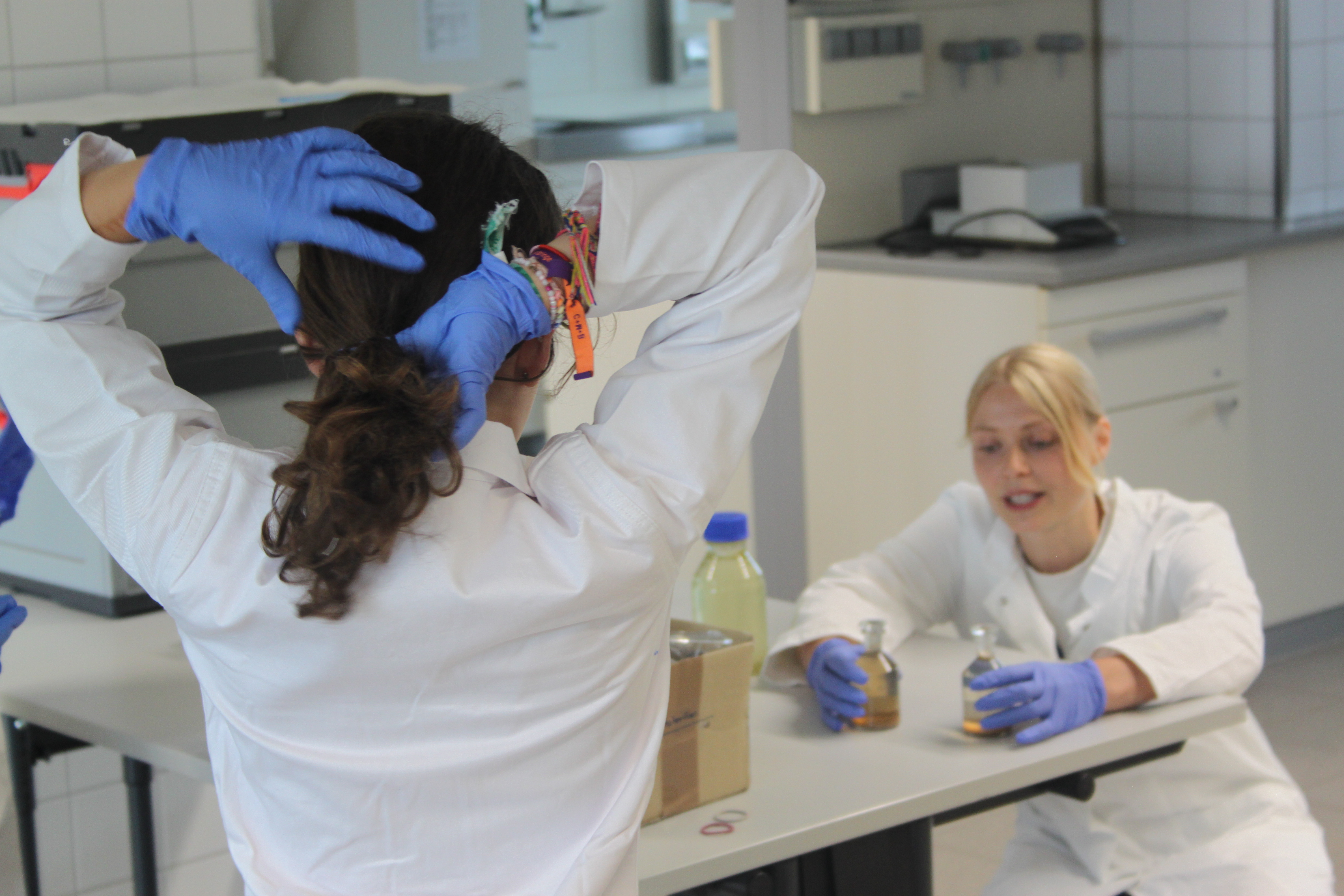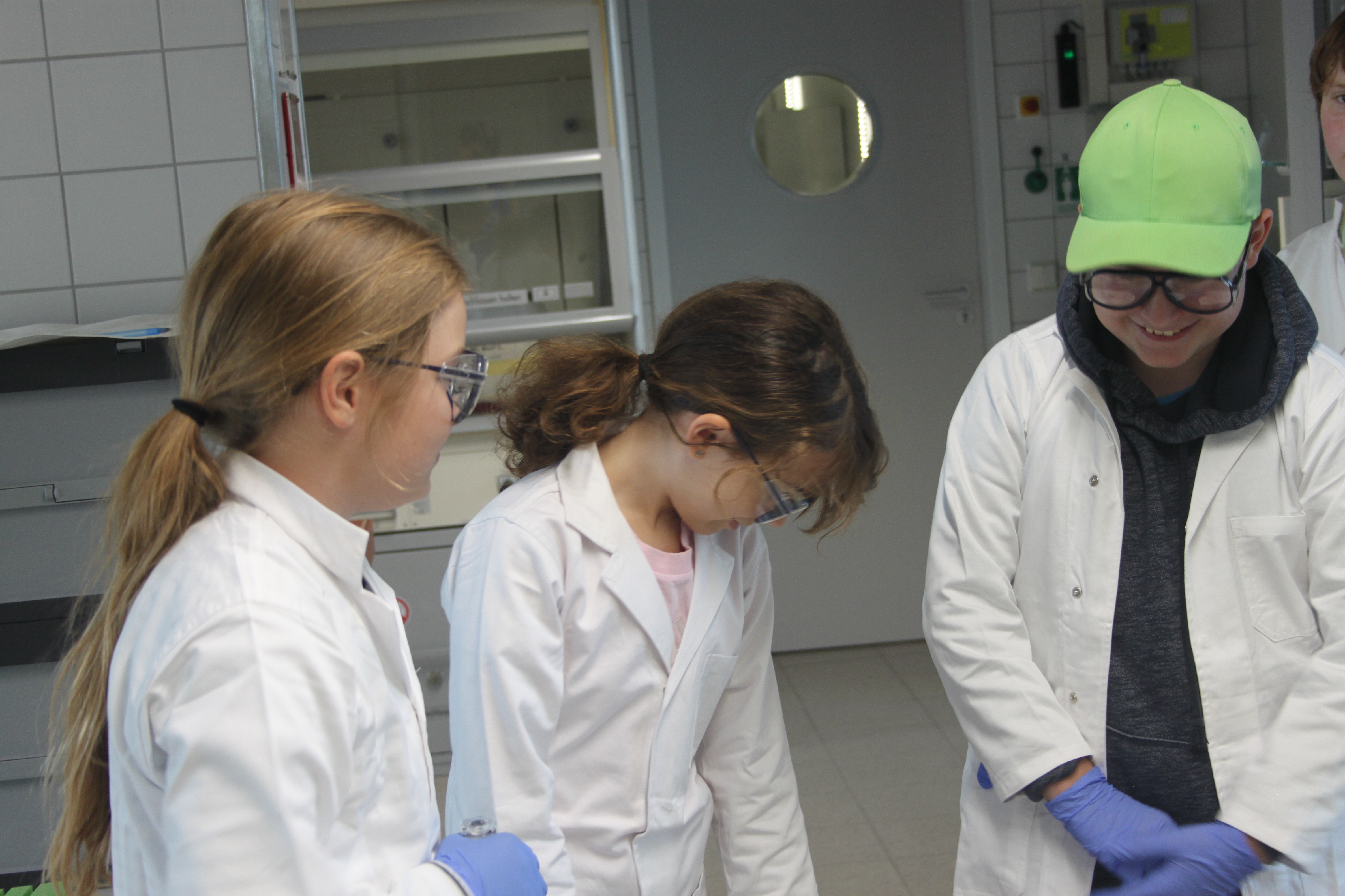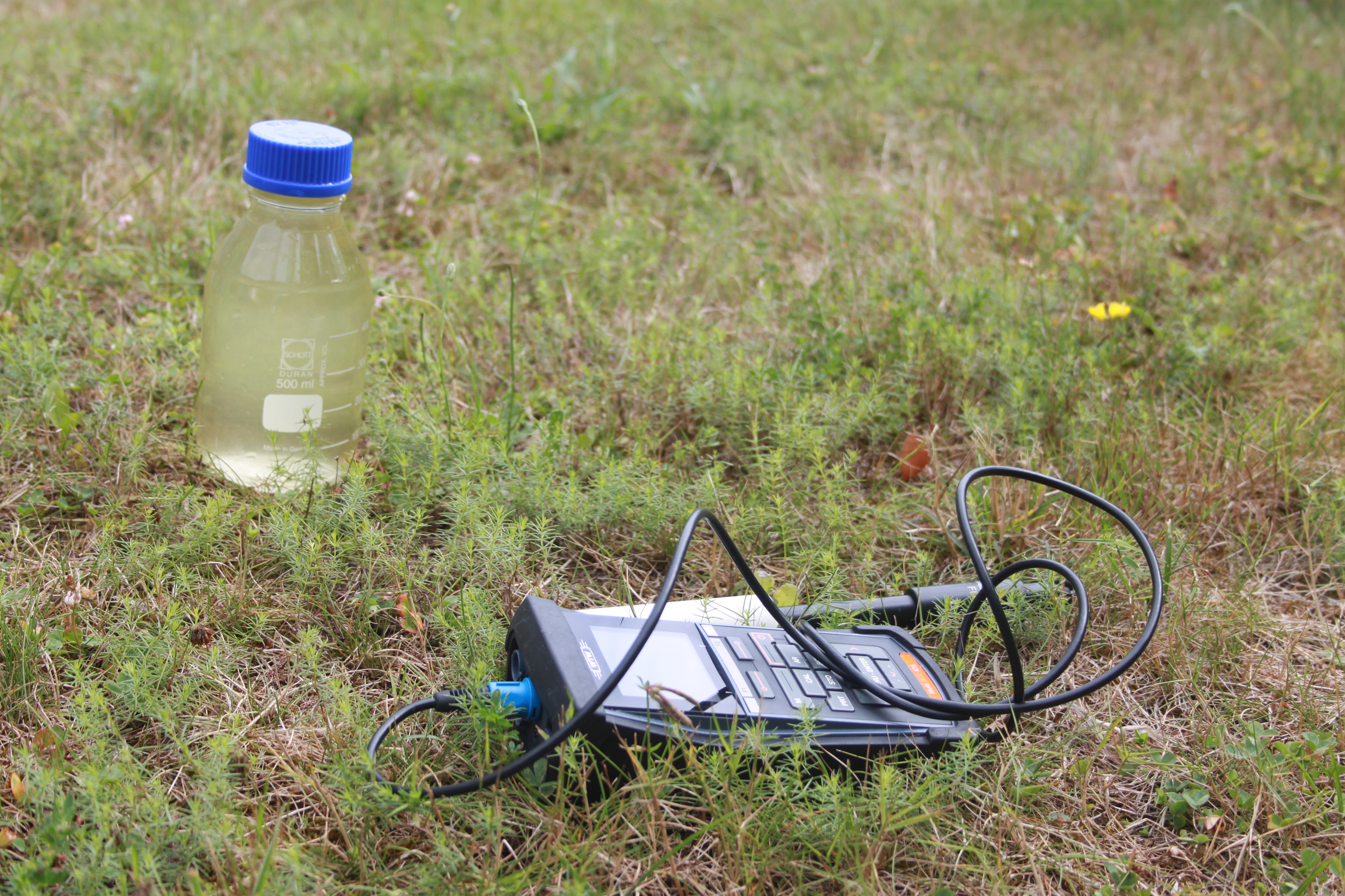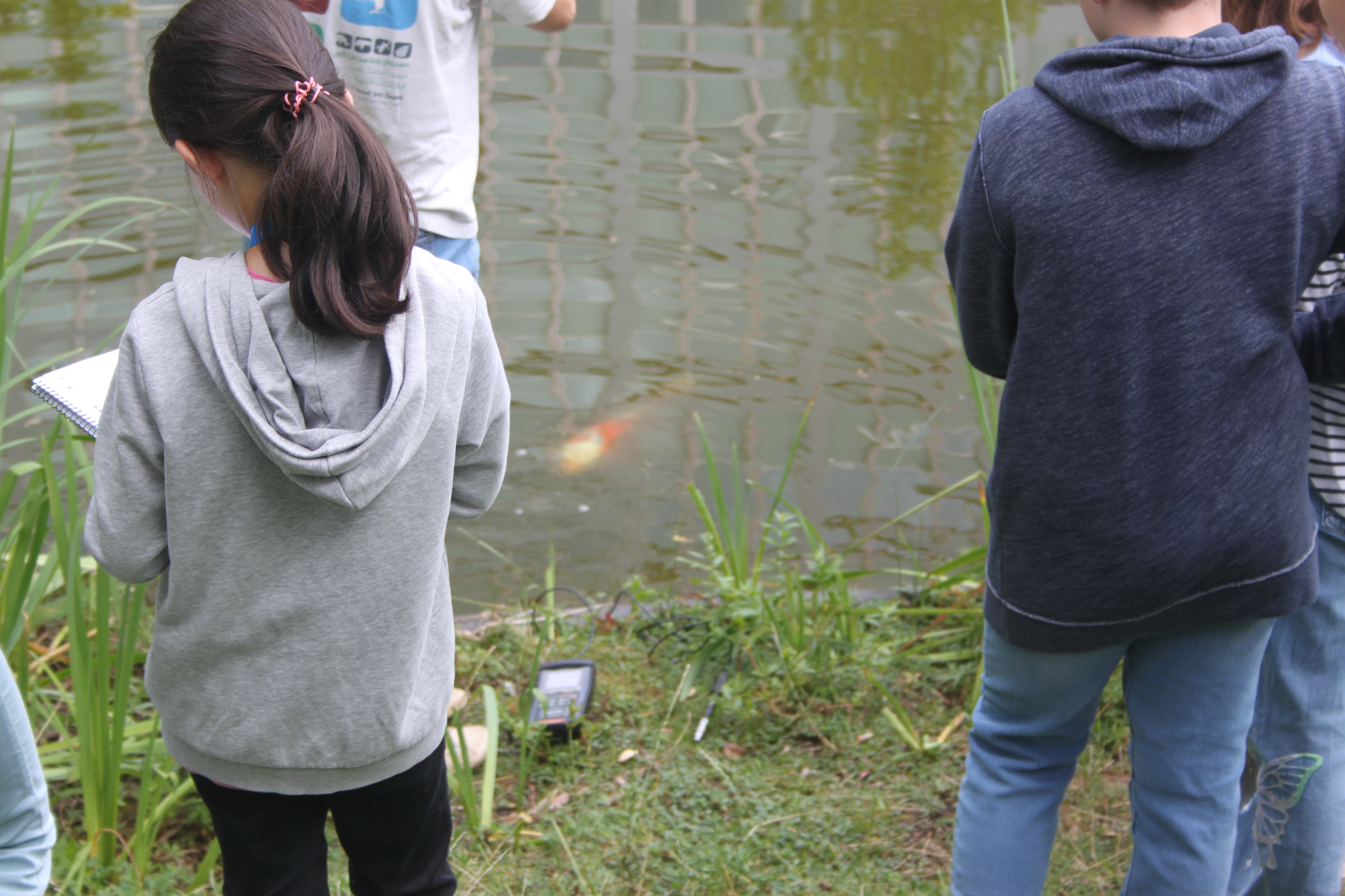 Wir haben den Sauerstoff im Teich der Uni gemessen. In einem schnell fließenden Bach ist mehr Sauerstoff. Der Koi-Karpfen lebt im Teich. In der Nacht ist nicht so viel Sauerstoff im Teich, ohne Luft können die Karpfen sterben. Wir haben mit der Pipette warmes Wasser mit verschiedenen Flüssigkeiten in die Probe hineingetropft. Wir füllten Wasser in eine Winkelflasche. Der Sauerstoff reagiert mit einem Metallmangan. Wenn ihr euch jetzt fragt, was Metallmangan ist: Das ist ein Stoff, der das Metall Mangan enthält. Er hilft uns dabei, den Sauerstoff im Wasser zu sehen und zu messen. Wenn der Sauerstoff im Wasser ist, reagiert er mit diesem Mangan-Stoff. Und zack! – die Flüssigkeit verändert ihre Farbe, und wir wissen: "Aha, da ist Sauerstoff!". Fünf Fische waren insgesamt im Teich. Es ist wichtig, dass Sauerstoff im Teich ist, sonst stirbt der Koi-Karpfen.