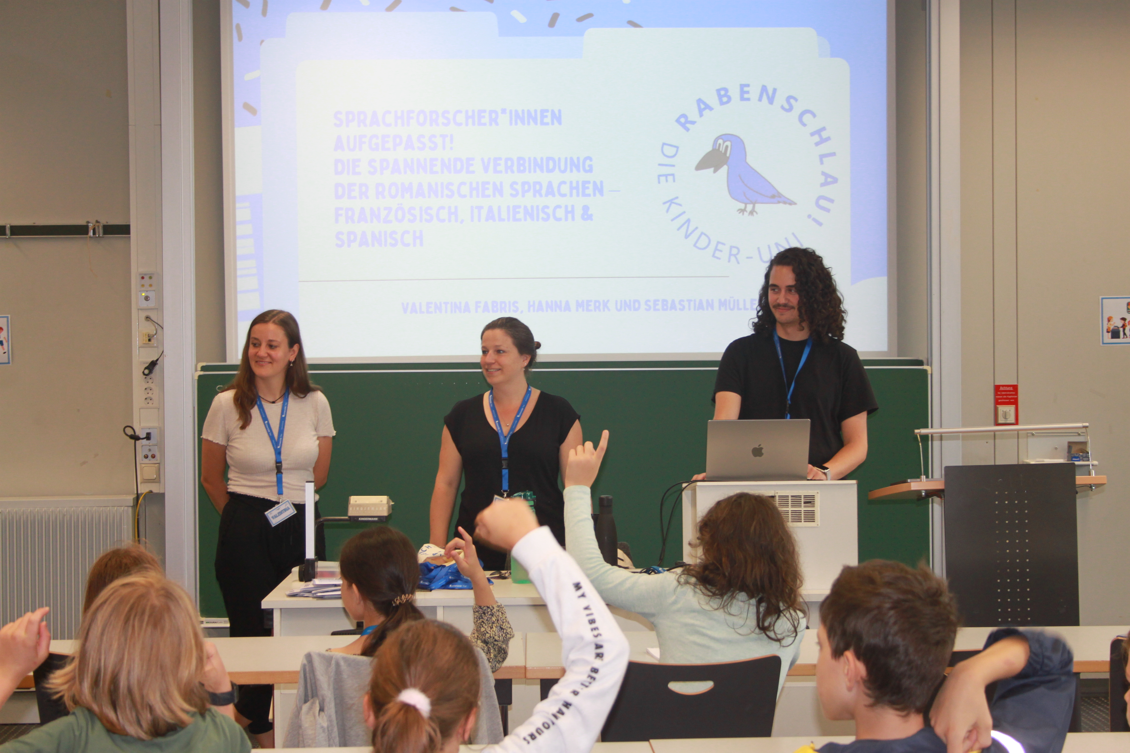 Französisch, Italienisch und Spanisch kommen aus dem Lateinischen. Die drei Sprachen sind so zu sagen Geschwister. Das Dozententeam der Veranstaltung „Sprachforscherinnen aufgepasst“ bestand aus Sebastian Müller, Dr. Hanna Merk und Valentina Fabris. Die Veranstaltung fand im Rahmen der Kinder-Uni der Universität Trier statt.