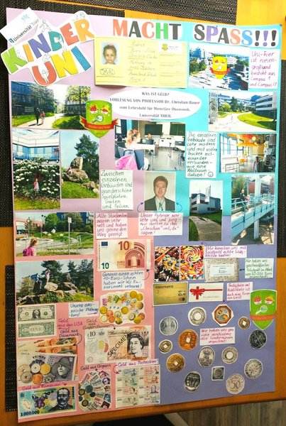 "Ich war sehr gespannt, wie es in der Uni Trier aussieht. Ehrlich gesagt, habe ich so was wie Hogwarts von Harry Potter erwartet, aber alles war sehr modern, wie eine Weltraumstation! :) Ich habe an der Vorlesung "Was ist Geld?" 2018 teilgenommen. Es war supercool! Unser Professor war kein alter strenger Mann, sondern jung und sehr nett. Ich fand es interssant, wie schwierig es ist, den Wert von dem Geld zu verstehen - besonders, als wir einen Geldschein verbrannt haben [...]. Ich habe ein riesengoßes Plakat mit vielen Fotos gemacht, damit alle Kinder sehen können, dass die Kinder-Uni megacool ist!", sagt Kiara-Mila, eine Kinder-Uni Studentin 2018. Für ihre Schule hat sie ein buntes Plakat über ihre Erfahrungen an der Kinder-Uni gebastelt, "damit alle Kinder sehen können, dass die Kinder-Uni mega cool ist".
