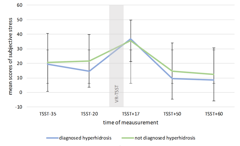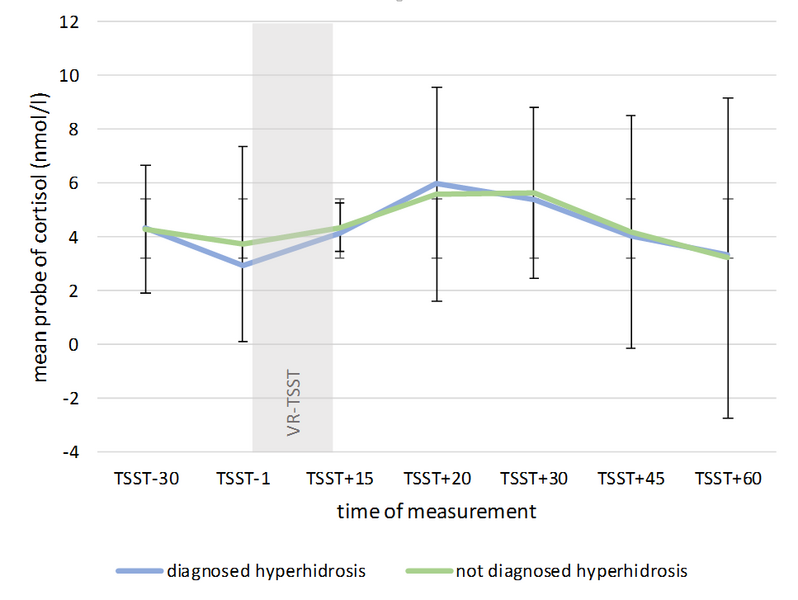 In this pilot study, we conducted VR-TSSTs under controlled conditions and performed general linear models with repeated measurements for cortisol levels, axillary sweat and subjective stress ratings for two groups (diagnosed hyperhidrotics (N=10), healthy controls (N=33)). All hyperhidrotics were diagnosed by physicians and additionally filled the hyperhidrosis impact questionnaire (HHIQ).