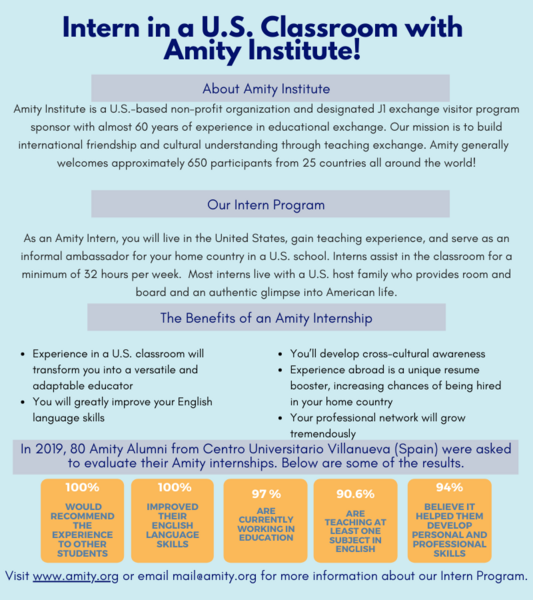 Amity – Intern Teacher Program: Be a classroom assistant at various schools in the USA for one semester (5 months) or a year (10 months). You'll need to have completed at least 4 semesters of study, preferably in an Education degree programme. You'll work at a school for around 32 hours per week doing observations, assistant teaching, presenting your home country's culture, preparing teaching materials, and also participating in extra-curricular activities. The application costs are around $500, but participants receive a monthly stipend of $200 minimum as well as free accomodation, usually catered (a value of approximately $900 per month). Contact Ms Ebbert-Hübner (ebbert@uni-trier.de) for more information, or check out the website www.amity.org or the flyer here: Amity Informational Flyer.