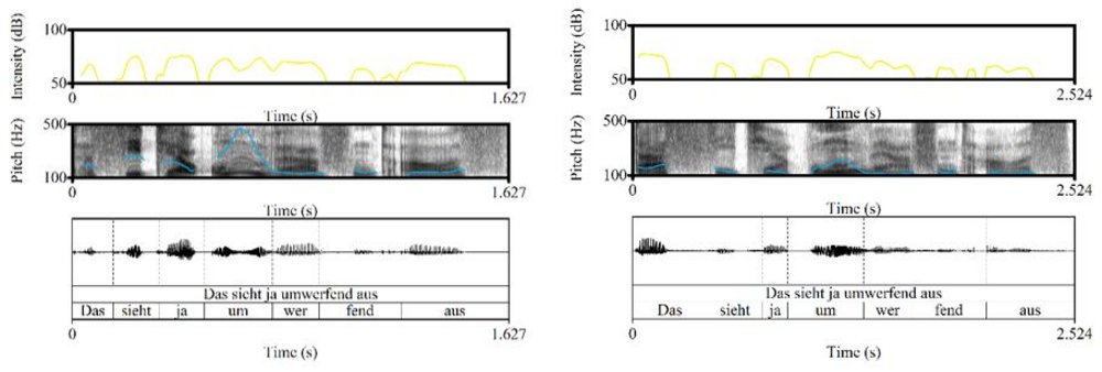 Das Dissertationsprojekt verfolgt das Ziel, ironische Äußerungen (z. B. Das sieht ja umwerfend aus) sowohl in ihrer Produktion als auch in ihrer Perzeption zu untersuchen und mögliche Unterschiede zwischen den Regionalakzenten Moselfränkisch (in der Region Trier) und Niederalemannisch (in der Region Freiburg) herauszuarbeiten. Erste Analyseergebnisse des Produktionsexperiments zeigen hinsichtlich der Grundfrequenz, Intensität und Dauer die typischen Merkmale von sarkastischer Ironie (ironisch intendierte Äußerungen sind tiefer, leiser und länger als aufrichtig gemeinte, Abb. 1), sowie Anzeichen für regionalspezifische Intonations- und Stimmqualitätsunterschiede.