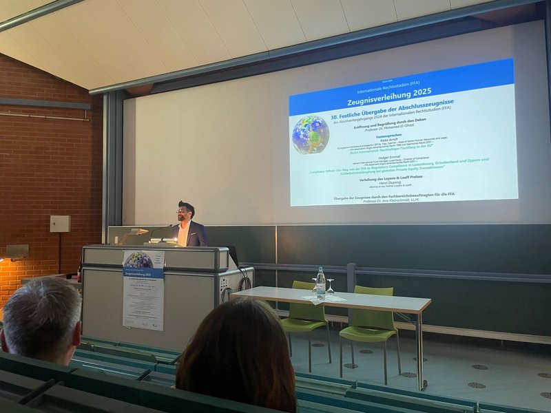 - Holger Emmel, Advent International Fund Manager, Luxemburg – Director of Compliance, - FFA Absolvent Anglo-Amerikanisches Recht 2001 –, "Compliance Officer: Der Weg von der FFA zu Regulatory Compliance in Luxembourg, Griechenland und Zypern und Geldwäschebekämpfung bei globalen Private Equity Transaktionen."