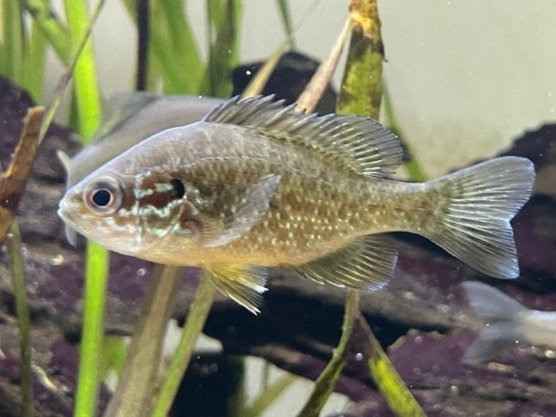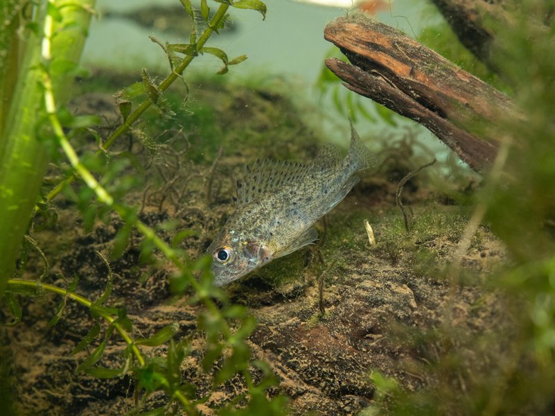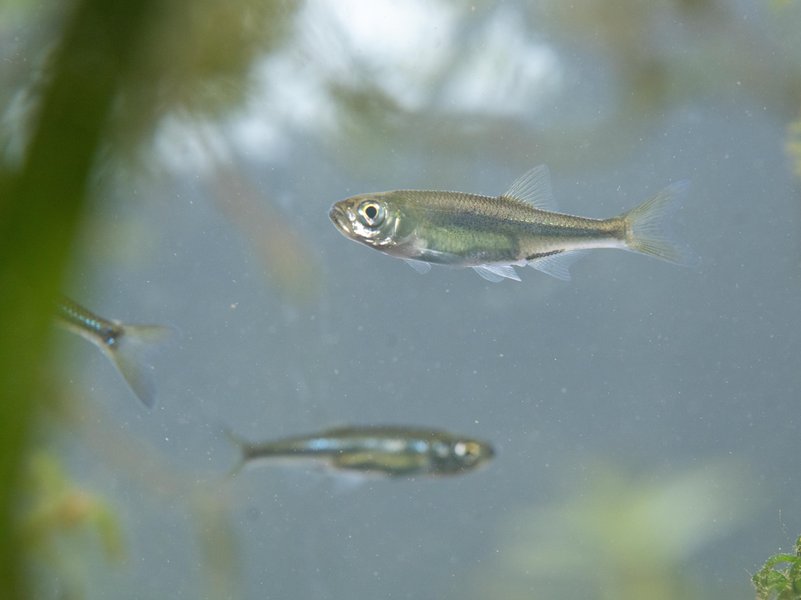 Der Bitterling (Rhodeus amarus) ist der kleinste (bis max. 8 cm) einheimische Karpfenfisch unserer heimischen Gewässer. Auffälliges Merkmal ist die blaugrüne Längsbinde sowie die kurze Seitenlinie. Sie bewohnen stehende bis langsam fließende, sommerwarme, pflanzenreiche Gewässer wie Niederungsbäche und -flüsse, Altarme und Grabensysteme. Bitterlinge ernähren sich vorwiegend von Algen, Plankton, Detritus und Wirbellosen. Bei der Vermehrung ist der Bitterling auf die Teichmuschel angewiesen. Dabei sucht sich das zur Paarung auffällig gefärbte Männchen eine Teichmuschel aus und verteidigt diese gegen andere Fische. Ein passendes Weibchen (Rogner) legt dann mithilfe einer ausgeprägten Legeröhre den Laich durch eine Öffnung in die Muschel ab, wo sie danach vom Männchen (Milchner) befruchtet werden. Der Bitterling nutzt die Teichmuschel sozusagen als Brutkammer. Im Aquarium kann dieses Verhalten während der Laichzeit der Bitterlinge, also ca. zw. April und Juni, ebenfalls beobachtet werden.