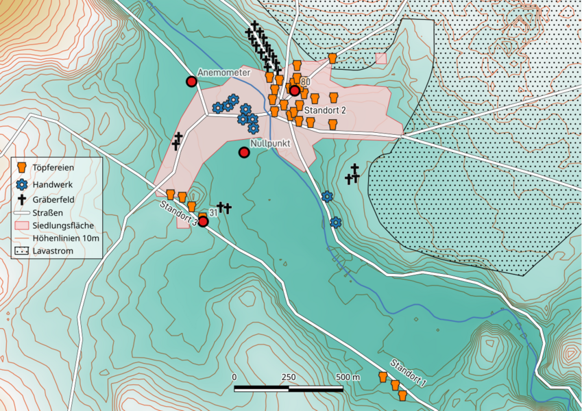 Aus den archäologisch belegten Töpfereien wurden die Fundstellen 80 im Bereich “auf der Eich” sowie 31 im Bereich “Siegfriedstraße” ausgewählt. Der Nullpunkt des Modells wird etwa in der Mitte gewählt und ein Rechnnetz fest vorgegeben, das beide Quellen einschließt.