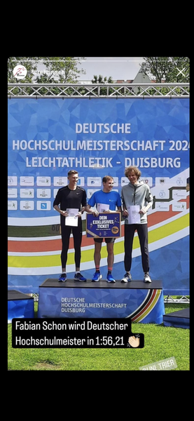 Fabian Schon, Student der Universität Trier, startete am 09. Mai 2024 in Duisburg bei den Deutschen Hochschulmeisterschaften in der Leichtathletik und gewann den 800m-Lauf mit einer Zeit von 1:56,21 Minuten. In einem Zielsprint setzte er sich knapp gegen Athleten der Universität Ulm und der Universität Gießen durch und sicherte sich den Titel des Deutschen Hochschulmeisters 2024.
