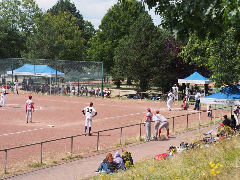 Im ersten Spiel traten wir gegen die Travellers aus Köln an, die auch in diesem Jahr eines der besten drei Teams der Liga sind, und gaben alles. Wir konnten einige Punkte erzielen – was gegen Köln schon immer eine Leistung ist! – und das Spiel lange spannend halten, die Niederlage letztlich aber nicht verhindern. Das Endergebnis war 12:22 im 5. Inning für die UCE Travellers.
