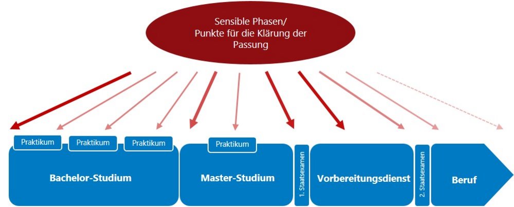 Eine Eignungs- und Neigungsreflexion im Sinne einer Prüfung der Passung von Person und Beruf ist also erforderlich, aber wie? Dies ist keine Frage, die man punktuell zu einem Zeitpunkt X klären kann, sondern ein Prozess der immer wiederkehrenden Reflexion und Beratung im Lauf der professionellen Entwicklung zur Lehrer:in. Für diese Reflexion gibt es besonders sensible Phasen, z.B. der Studienbeginn, die Praktika, der Zeitpunkt der Schulartwahl, der Übergang in den M.Ed. u.ä.