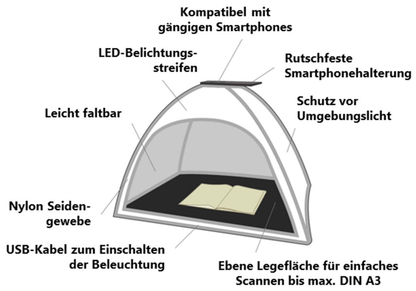 Das Scanzelt „ScanTent“ ist eine flexible, kontaktlose Scanlösung, die das materialschonende Erfassen großer (bis DIN A3), empfindlicher Vorlagen mit dem in Verbindung mit dem Smartphone sowie einer Scan-App ermöglicht. Es ergänzt die vorhandenen Zeutschel-Scanner und ermöglicht aufgrund seiner Grundfläche (Breite: 76 cm, Tiefe: 59 cm) die schnelle Erfassung verschiedenster Dokumente, Fotos, Karten, Pläne, Faltblätter oder Plakate.