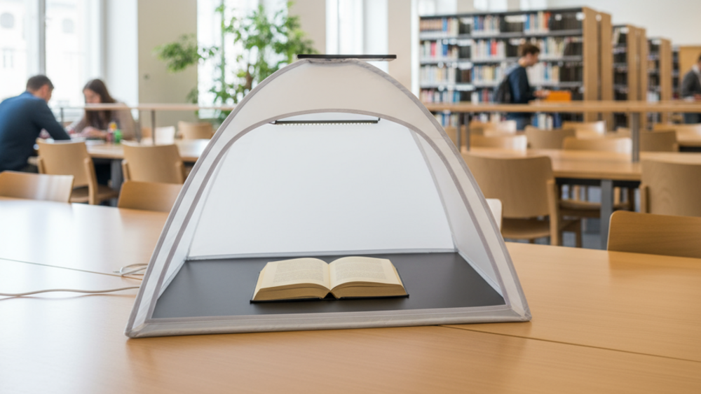 Das lichtoptimierte Zeltdesign sorgt für gleichmäßige Ausleuchtung und klare Ergebnisse, auch bei älteren oder empfindlichen Buchseiten. Da keine Glasplatte oder Druckmechanik erforderlich ist, bleiben die Materialien vollständig kontaktlos geschützt.