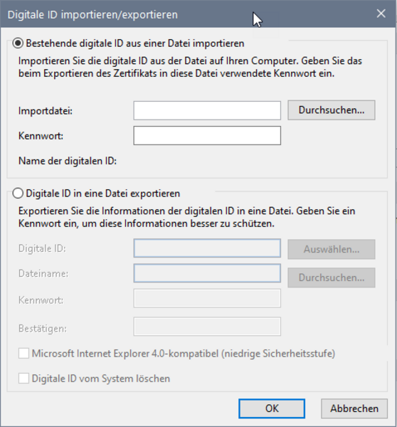 Wählen Sie jetzt im Feld Importdatei Ihre p12-Datei per Klick auf Durchsuchen... aus und geben das Kennwort ein, mit dem die Datei geschützt ist. Nachdem Sie einen für Sie eindeutigen Namen für die ID vergeben haben, bestätigen Sie bitte den Dialog mit OK (Bild 3).