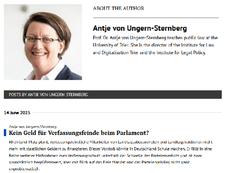 On June 14, 2025, an article by Prof. Dr. von Ungern-Sternberg appeared on the Verfassungsblog entitled “No money for enemies of the constitution in parliament? On the admissibility of funding restrictions for parliamentary staff.”