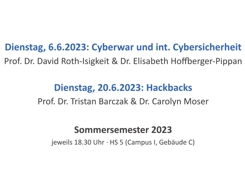 On Tuesday, June 6, 2023, at 6:30 p.m., Prof. Dr. David Roth-Isigkeit (Deutsche Universität für Verwaltungswissenschaften Speyer) will speak first on the topic of „Cyberwar and International Law: The Stony Road to a Digital World Peace Order". This will be followed by a presentation by Dr. Elisabeth Hoffberger-Pippan (Leibniz-Institut Hessische Stiftung Friedens- und Konfliktforschung) on „Russia's Cyberwar in Ukraine."
