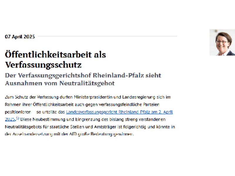 On April 7, 2025, an article by Prof. Dr. von Ungern-Sternberg appeared on the Verfassungsblog (Constitutional Law Blog) entitled “Public relations as constitutional protection – The Constitutional Court of Rhineland-Palatinate sees exceptions to the requirement of neutrality.”