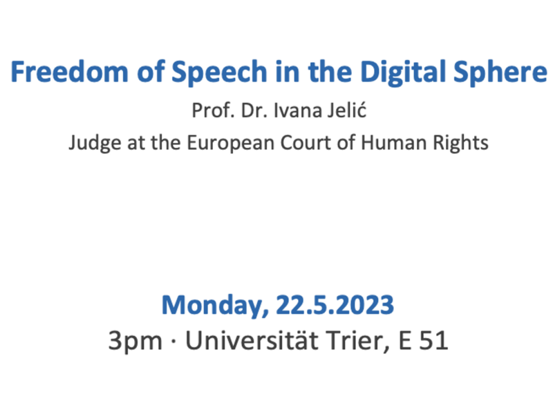 The Institut für Recht und Digitalisierung (IRDT) is pleased to announce that Prof. Dr. Ivana Jelić, Judge at the European Court of Human Rights, will give a lecture on „Freedom of Speech in the Digital Sphere" at an IRDT Lecture on Monday, May 22, 2023, at 3 pm.