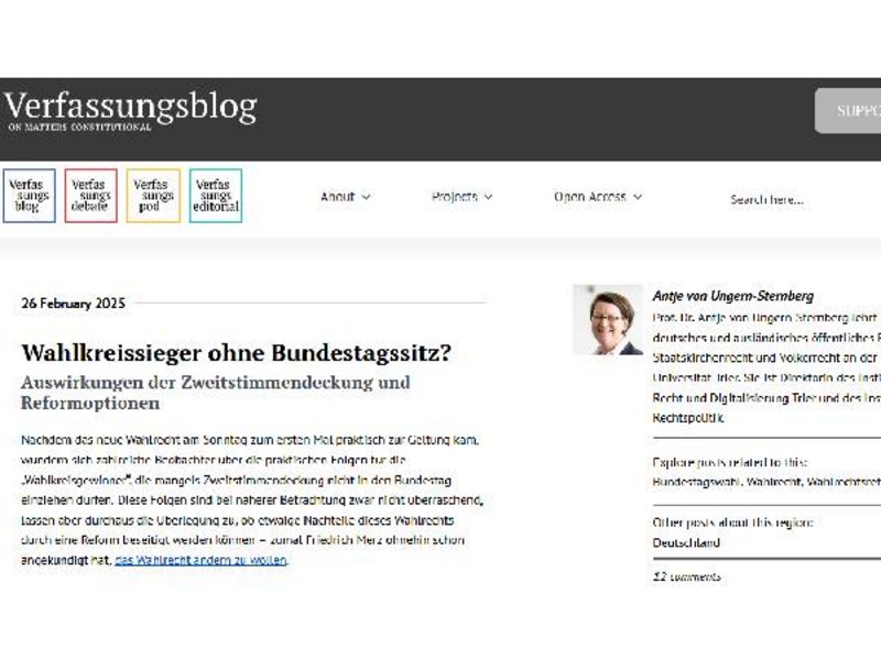On February 26, 2025, an article by Prof. Dr. von Ungern-Sternberg was published on the Verfassungsblog with the title “Wahlkreissieger ohne Bundestagssitz? - Effects and reform options”.