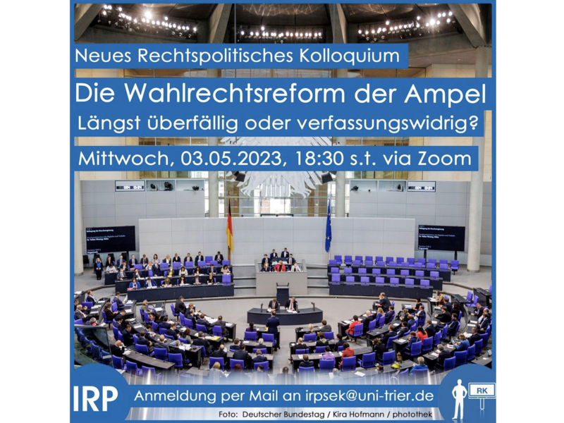 On May 3, 2023, the Institut für Rechtspolitik an der Universität Trier (IRP) invites you to an online lecture by constitutional law expert Prof. Dr. Christoph Möllers (Humboldt-Universität zu Berlin) on the traffic light electoral reform and a subsequent classification by sociologist and chair of the German Society for Electoral Research Prof. Dr. Sigrid Roßteutscher (Goethe-Universität Frankfurt a.M.). In addition, Mr. Michael Frieser (Member of the Bundestag and legal advisor to the CDU/CSU Bundestag faction) will contribute a co-lecture. After the presentations, there will be an opportunity for discussion. The online event will start at 18:30 via Zoom.