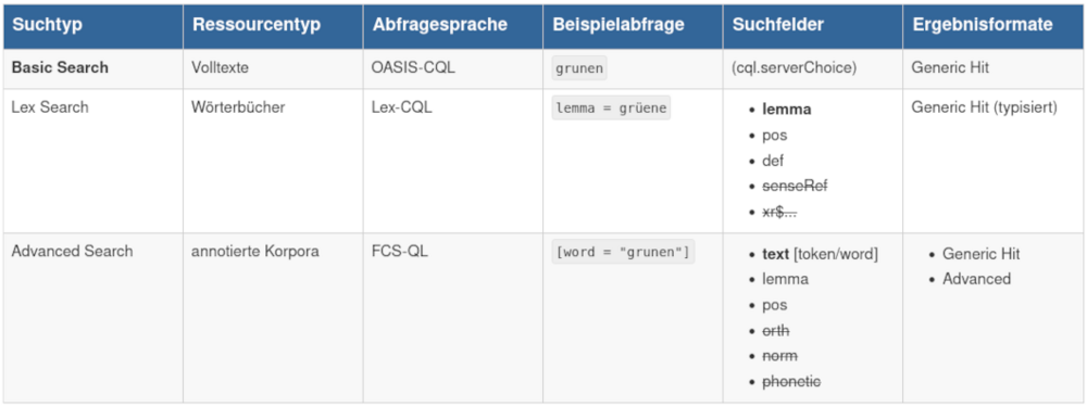 MWB-APIplus folgt der Clarin-FCS- und der Text+ LexFCS-Spezifikation für die Lexikalische Suche. MWB-APIplus realisiert für das Textarchiv des MWB die Textplus "Basic Search" und die "Advanced Search" (s. die Übersicht unten). Letztere erlaubt einen Zugriff auf die Annotationsebene der Texte. Der Endpunkt ist im TextPlus-Aggregator registriert und kann über ihn abgefragt werden.