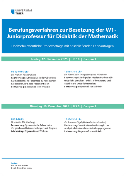 Am Freitag, den 12. Dezember 2025, im HS 10, sowie am Dienstag, den 16. Dezember 2025, im HS 9 findet an der Universität Trier das Berufungsverfahren zur Besetzung der W1-Juniorprofessur für Didaktik der Mathematik statt. Im Rahmen des Verfahrens werden hochschulöffentliche Lehrvorträge gehalten. Die Veranstaltung bietet allen Interessierten die Gelegenheit, die Bewerberinnen und Bewerber um die Professur kennenzulernen und Einblicke in ihre wissenschaftlichen und didaktischen Ansätze zu erhalten.