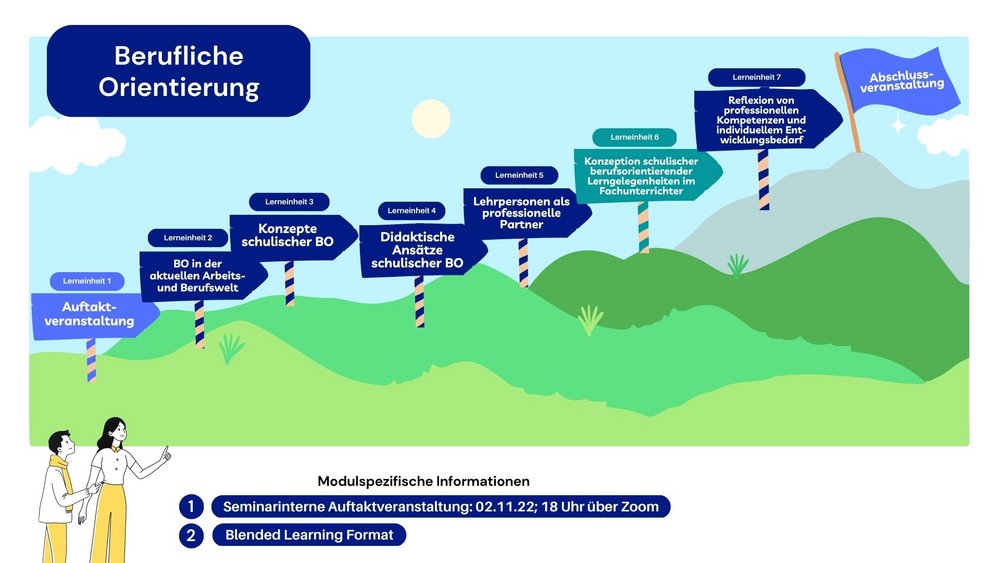 Wie kann Berufliche Orientierung in Ihren Fächern vermittelt werden? Sie vertiefen Ihre Kompetenzen zur Individualisierung von Lernprozessen im Kontext der schulischen Berufsorientierung, indem Sie vor Ihren fachlichen Hintergründen (digitale) Lerngelegenheiten zur Förderung berufswahlrelevanter Kompetenzen konzipieren und somit Beiträge zur Qualitätsentwicklung schulischer BO leisten.