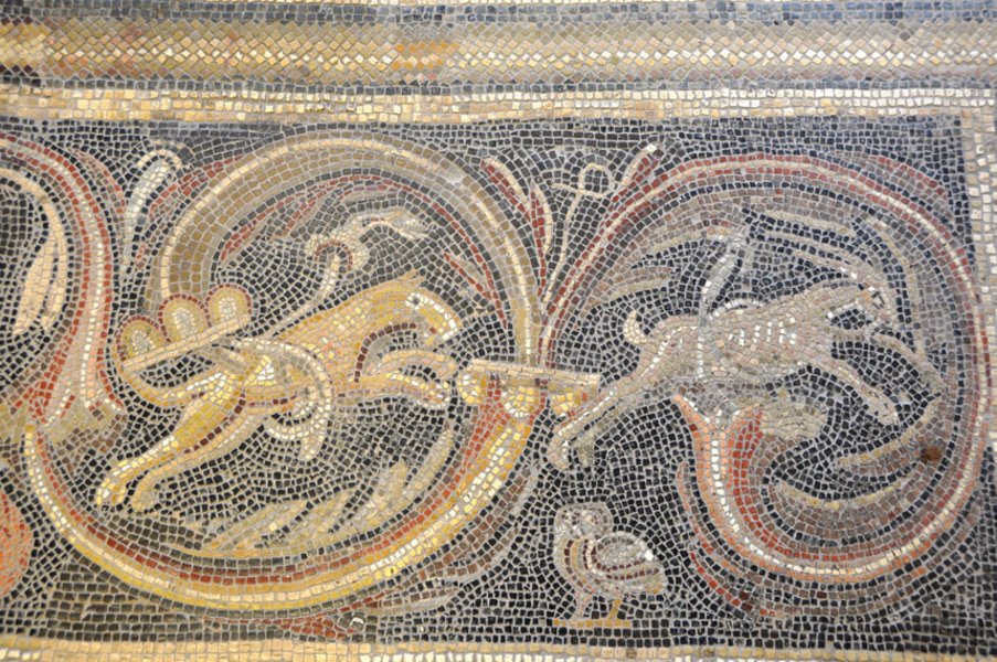 Detailansichten in der Villa freigelegter Mosaike: Bei ihrer Verfolgungsjagd