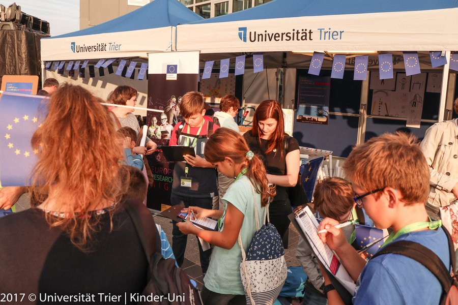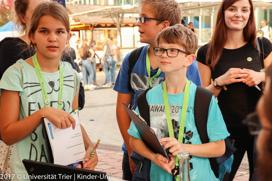Mit den Kinderreportern der Kinderuni Trier trafen wir uns allerdings schon früher, als die Sonne uns trotz vorangeschrittenem Septembertag noch sommerliche 25°C schenkte. Wir wollten ja schließlich viel lernen und möglichst viel erleben. Der City Campus hatte sich in diesem Jahr auf dem Viehmarktplatz, sogar in den Viehmarktthermen, in der Neustraße und dem Bischöflichen Angela-Merici-Gymnasium ausgebreitet. Am liebsten wollten wir überall gleichzeitig anfangen.