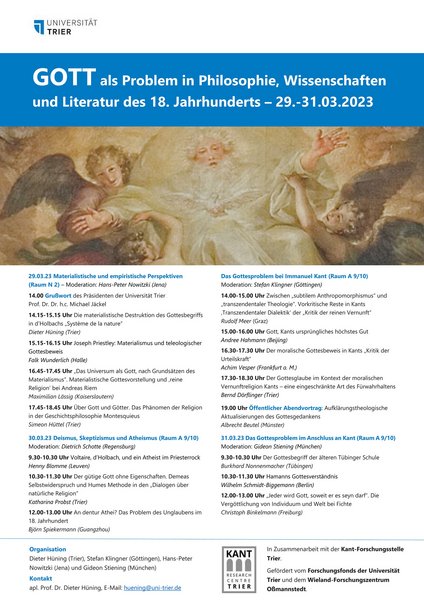 11.45–12.45: Dieter Hüning (Trier): „[D]iese moralische Ordnung ist das Göttliche, das wir annehmen“. Radikalisierungen Kantischer Positionen im Atheismusstreit von 1799
