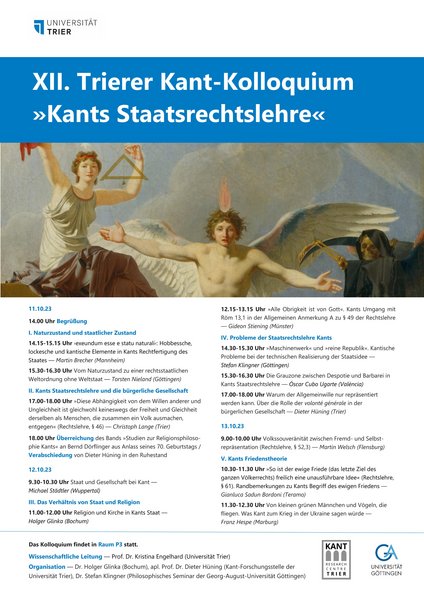 Wie für das Trierer Kant-Kolloquium üblich, wird es unter Beteiligung von auswärtigen Referentinnen und Referenten aus dem Inland sowie aus Belgien, Italien, Österreich und China sowie von Studierenden stattfinden.