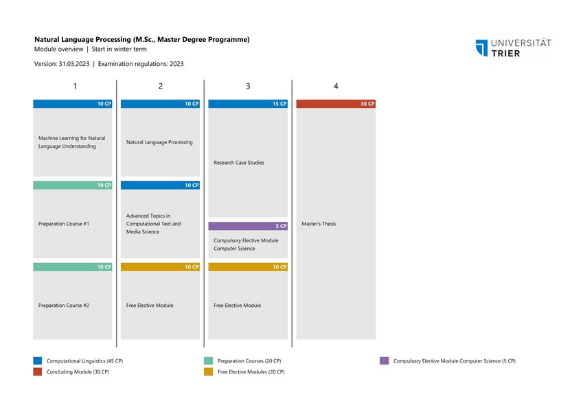 Automation is bringing about profound changes in all areas of social and professional life, including science. A core technology that is driving this revolution is Artificial Intelligence and specifically Natural Language Processing. The degree programme Natural Language Processing enables students to accompany and shape these changes. It is interdisciplinary and deals with digitally-mediated language in its entire breadth: from written texts to audiovisual and social media.