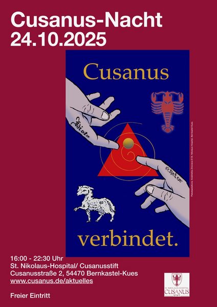 Das St. Nikolaus-Hospital/Cusanusstift öffnet unter dem Motto „Cusanus verbindet" am 24.10.2025 zur Cusanus-Nacht seine Türen für Interessierte. Das Cusanus-Institut Trier beteiligt sich mit theologischen und historischen Impulsvorträgen von Dr. Viki Ranff, Aline Fries, M.A., und Alexandra Geissler, M.A. am Rahmenprogramm. Weiter bietet das Cusanus-Institut unter Leitung von Aline Fries, M.A., Alexandra Geissler, M.A., und Elke Välilä, M.A., Spiel und Spaß für Jung und Alt in Form des eigens angefertigten Cusanus-Memory und Cusanus-Bingo an.