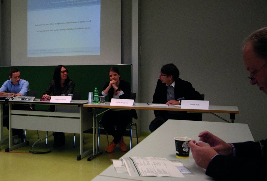 Den zweiten Tagungstag und den Themenblock zur Kandidatenauswahl eröffnete Florian Glock (Trier). Er referierte zur „Rekrutierung von (Ober-) Bürgermeisterkandidaten in Deutschland – ein theoretischer Blick auf die innerparteilichen Auswahlprozesse“. Glock zeigte auf, dass die innerparteiliche Kultur sowie die politische Konstellation (Oberbürgermeister und Landesregierung) Einflussfaktoren auf die innerparteiliche Auswahl darstellen und gab einen Ausblick auf seine weiteren Forschungen zu Selektionsmustern von Bürgermeisterkandidaten.