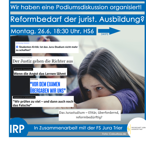 Seit Jahren gibt es Diskussionen über eine Reform der juristischen Ausbildung. Doch die Debatte ist aktueller denn je. Im Rahmen einer breit angelegten Studie des Bündnisses iur.reform haben über 11.000 Personen aus den Bereichen des juristischen Studiums, der Lehre und der Praxis über Reformperspektiven abgestimmt. Gleichzeitig bereitet das Land Rheinland-Pfalz eine Änderung der Prüfungsordnung vor, die neben der Einführung des Teilzeit-Referendariats und einer digitalisierten Verwaltung auch eine Anpassung des Prüfungsverfahrens und -stoffs vorsieht. Letztere riefen bei den Studierenden bundesweit spürbares Unverständnis hervor. In diesem Kontext veranstaltete das Institut für Rechtspolitik an der Universität Trier am 26. Juni 2023 eine Podiumsdiskussion, in der Vertreter aller Interessensgruppen an einen Tisch gebracht wurden. Die Teilnehmerinnen und Teilnehmer sind im Bild von links nach rechts zu sehen: Der Präsident des OVG und des VGH Rheinland-Pfalz Prof. Dr. Lars Brocker teilte seine Perspektive aus der Justiz. Mit Dr. Matthias Frey war ein Staatssekretär des rheinland-pfälzischen Justizministeriums vertreten, der mehr über die Zielsetzung der Änderungsvorhaben zu berichten wusste. Der geschäftsführende Direktor des Instituts für Rechtspolitik Prof. Dr. Thomas Raab moderierte die Diskussion. Für Lehre und Universität sprach die Dekanin des juristischen Fachbereichs der Universität Trier Prof. Dr. Antje von Ungern-Sternberg. Für das Bündnis iur.reform war Mert Dinçer angereist und Lars Kettermann sprach als Vertreter der Fachschaft Jura an der Universität Trier für die Studentinnen und Studenten.