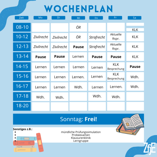Basierend auf unseren eigenen Erfahrungen in der Examensvorbereitung haben wir euch eine Empfehlung für einen Wochenplan gebastelt (hier klicken zum Download). Sie dient als Beispiel und soll vor allem euch verdeutlichen, dass ihr die Examensvorbereitung aufgrund ihrer hohen Arbeitsbelastung bestenfalls gut strukturiert angeht - das sorgt für Motivation und schützt vor Stress.