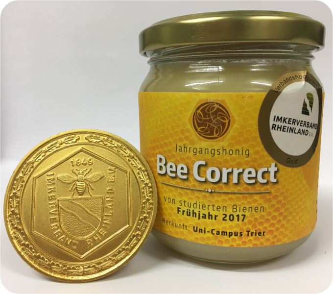 Bei der Honigprämierung des Deutschen Imkerbundes ist der Bee.Ed Honig 2018 der Universität Trier vom Imkerverband Rheinland ein weiteres Mal mit der Goldmedaille ausgezeichnet worden. Der Honig unserer „studierten Bienen“ erreichte erneut in allen Kategorien die höchste Punktzahl. Zudem hat er den geringsten Wassergehalt seit Beginn des Projektes, was ihn als besonders hochwertig ausweist. Frau Prof. Möller und das gesamte Team Bee.Ed freuen sich sehr über die Auszeichnung und den erneuten Erfolg in diesem Jahr. Die wohl beste Nachricht für unsere treuen Fans: Diesmal ist die Chance hoch, ein eigenes Glas „Goldhonig“ zu ergattern, denn unsere Bienen haben extrem fleißig gesammelt und uns eine Rekordernte beschert. Der Verkauf startet am 03. Dezember in den Cafeterien des Studiwerkes für 3 € zzgl. 0,50 € Pfand.