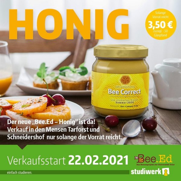 Weil die Trierer Uni-Bienen im vergangenen Jahr aufgrund schlechter Wetterverhältnisse kaum Honig produzieren konnten, ist die Freunde bei Frau Prof. Möller und dem gesamten Team Bee.Ed über die Auszeichnung in diesem Jahr besonders groß.
