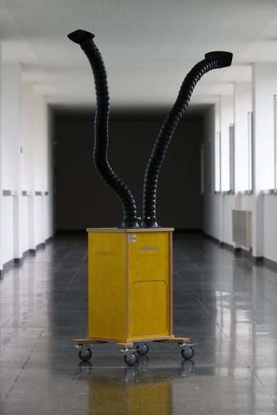 Um Plastik zu recyceln, müssen wir das Plastik schmelzen. Dabei können verschiedene Dämpfe freigesetzt werden, die wir mit unserem Luftfilter auffangen. Der Luftfilter wird dabei neben die Injektionspumpe gestellt. Mit seinen zwei langen Armen kann sowohl die Luft am Einfüllstutzen als auch an der Düse eingesaugt werden. Die Luft wird anschließend über einen Aktivkohlefilter geleitet und so von allen Dämpfen befreit.